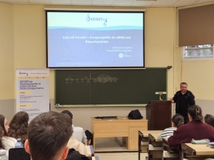 After the overview, the conferences focused on two main topics: first, the microbiology and genetics behind SECRETED, led by Dr. Montserrat Argandoña and PhD Candidate Tania Antón from Universidad de Sevilla; and second, a case study on siRNA encapsulation with biosurfactants led by Sebastián Ospina, from Blue Synergy. After the conferences, the students used the remaining time to ask questions, a valuable exchange for their academic development and for the goals of the social awareness workshop.